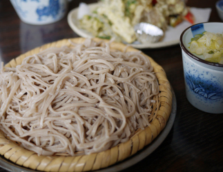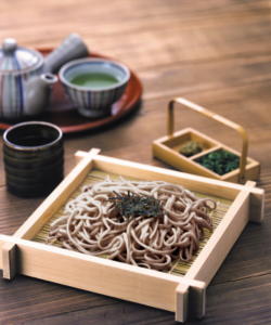 茹でたての熱いそばをそば湯と一緒に器に盛り、