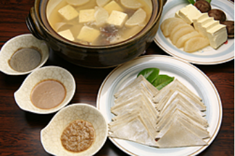 豆腐が煮上がったところで三角の「かっけ」を入れる。